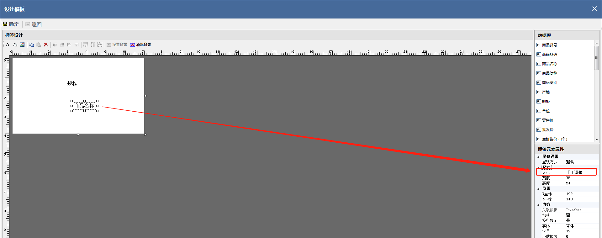 将模板里的商品名称框拉动竖向展示,并设置大小为手工计算,再打印预览